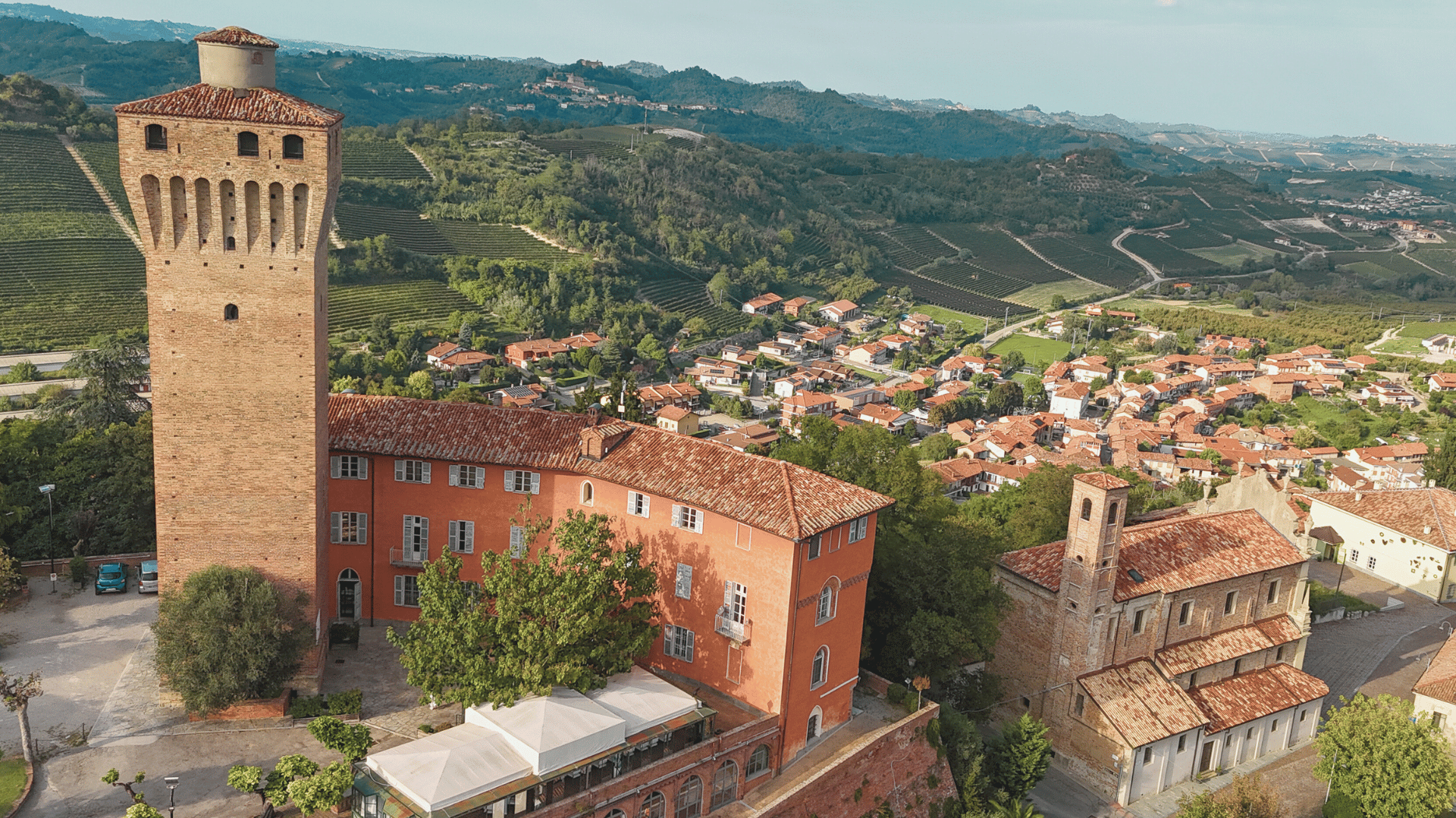 Perched above the sleepy village of Santa Vittoria d’Alba, Castello di Santa Vittoria is a boutique auberge built atop a medieval fortress dating back to around 1000 A.D. Two ancient watchtowers still stand sentinel, relics of the structure’s martial past.