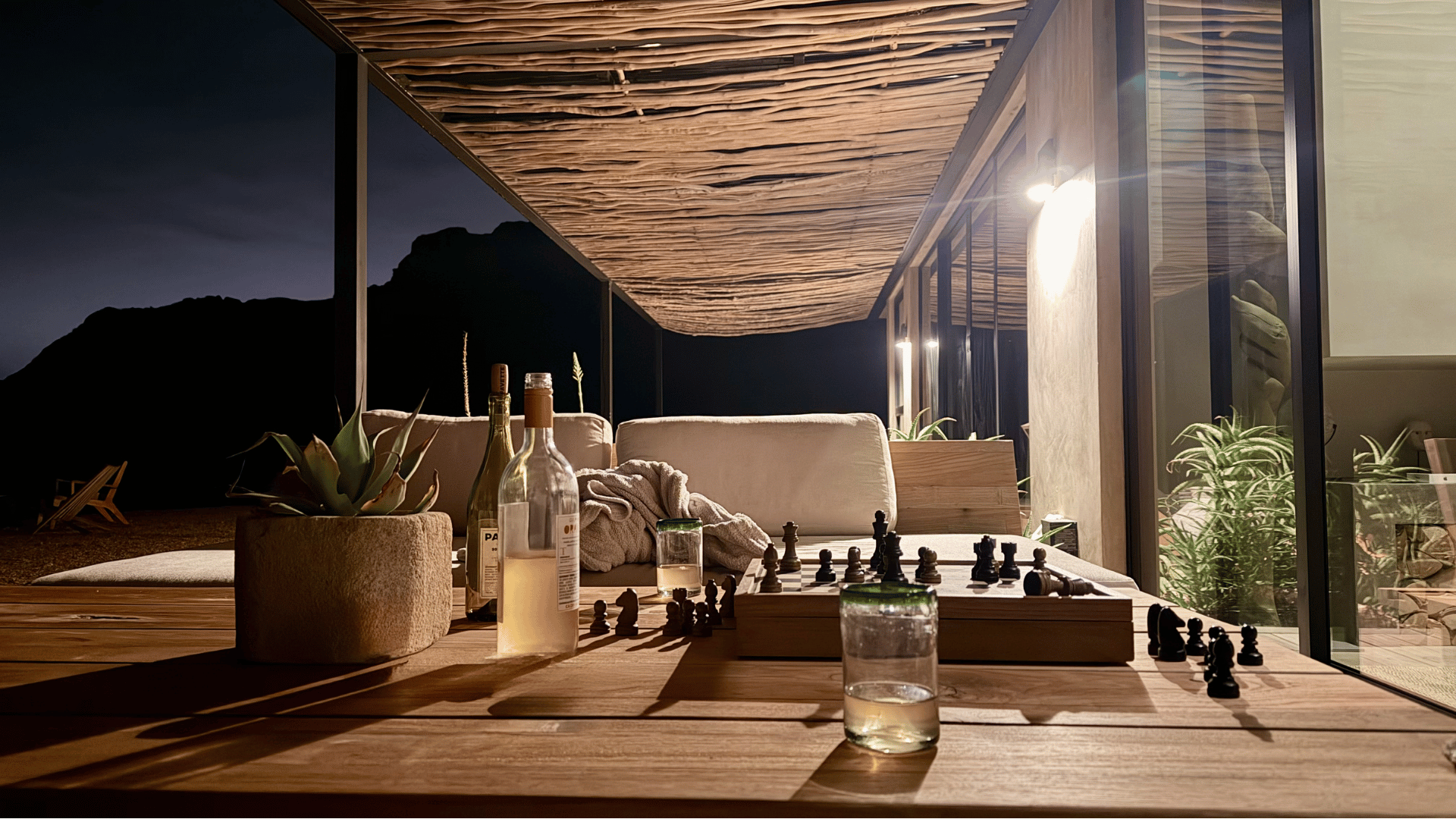 Back at the house, we ate gummies. Poured wine. Set up a chess board on the table outside. Music on, low.