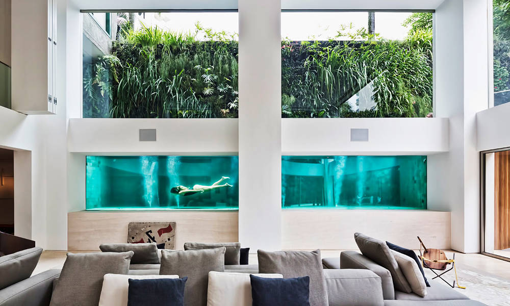 We’ve covered quite a few houses with incredible home features over the years. Having a pool seems like a pretty commonplace ask and not all that noteworthy, but that changes when you want the pool right next to the living room. This was what Fernanda Marques Arquitetos Associados tackled in a duplex apartment in São Paulo, Brazil. Marques, who was trained at the University of São Paulo’s School of Architecture and Urbanism, designed a pool enclosure from glass that stretches the entire length of the first floor living room and is as high as the ceiling would be if the room wasn’t so expansive. Accessing the pool can be done via stairs outside, or through the door next to the lofted bedroom upstairs. The minimal design of the space allows the client’s impressive art and furniture collection, along with features like vertical plant walls, to really take center stage despite the fact there’s a pool in the house.