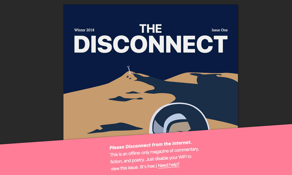 The battle for your attention rages from the moment you open your eyes until you close them at night. With the world at your fingertips, simple things like eating and reading become part of a multitasking experiment. The hand without a fork or book in it seems to always find the keyboard so you can check your email or Instagram feed. The Disconnect is a new online magazine that demands your full attention, and to get it the mag makes you shut off the Internet. Yup, you can’t read the short stories and articles in The Disconnect until you turn off your WiFi. Okay, we get that there are workarounds, but you get the point. No more mindlessly doing eight things at once. The Disconnect wants you to read a magazine like you were meant to read a magazine.