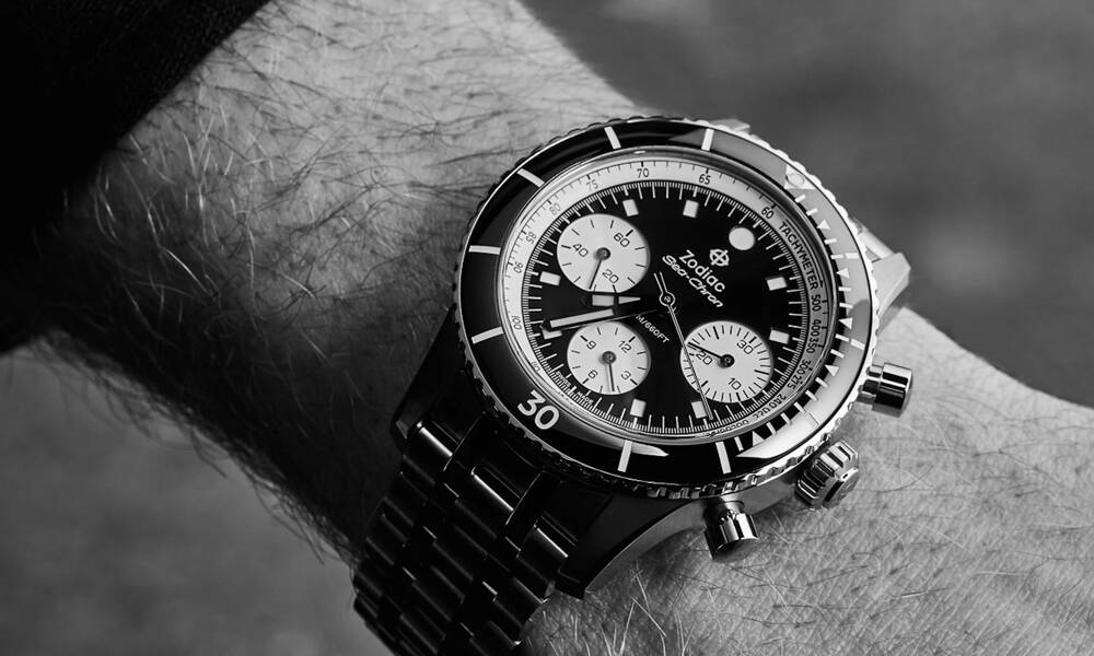 It’s about time Zodiac brought back the Sea-Chron, a chrono follow-up to its much-lauded Sea Wolf. Birthed in the ’60s, the Sea-Chron has recently resurfaced in modern form, and it’s a stunner. Changes to the original design include a different bezel, crystal, and, most importantly, movement. The case measures 42mm in diameter (up from the original’s 39mm width) with a 20mm lug width and a 16.5mm height. It’s a chunky watch with presence. The dial is more complex the second time around with a multi-level dial with a sunray finish, lumed sandwich markers, and recessed subdials. The bezel insert is no longer aluminum but polished ceramic. Timekeeping duties come from an automatic Sellita SW510 b with a 30-minute register at 3, a 12-hour register at 6, and running seconds at the 9 o’clock position. If you can manage the increased size, it’s one of the best-looking chronographs to emerge in a while.